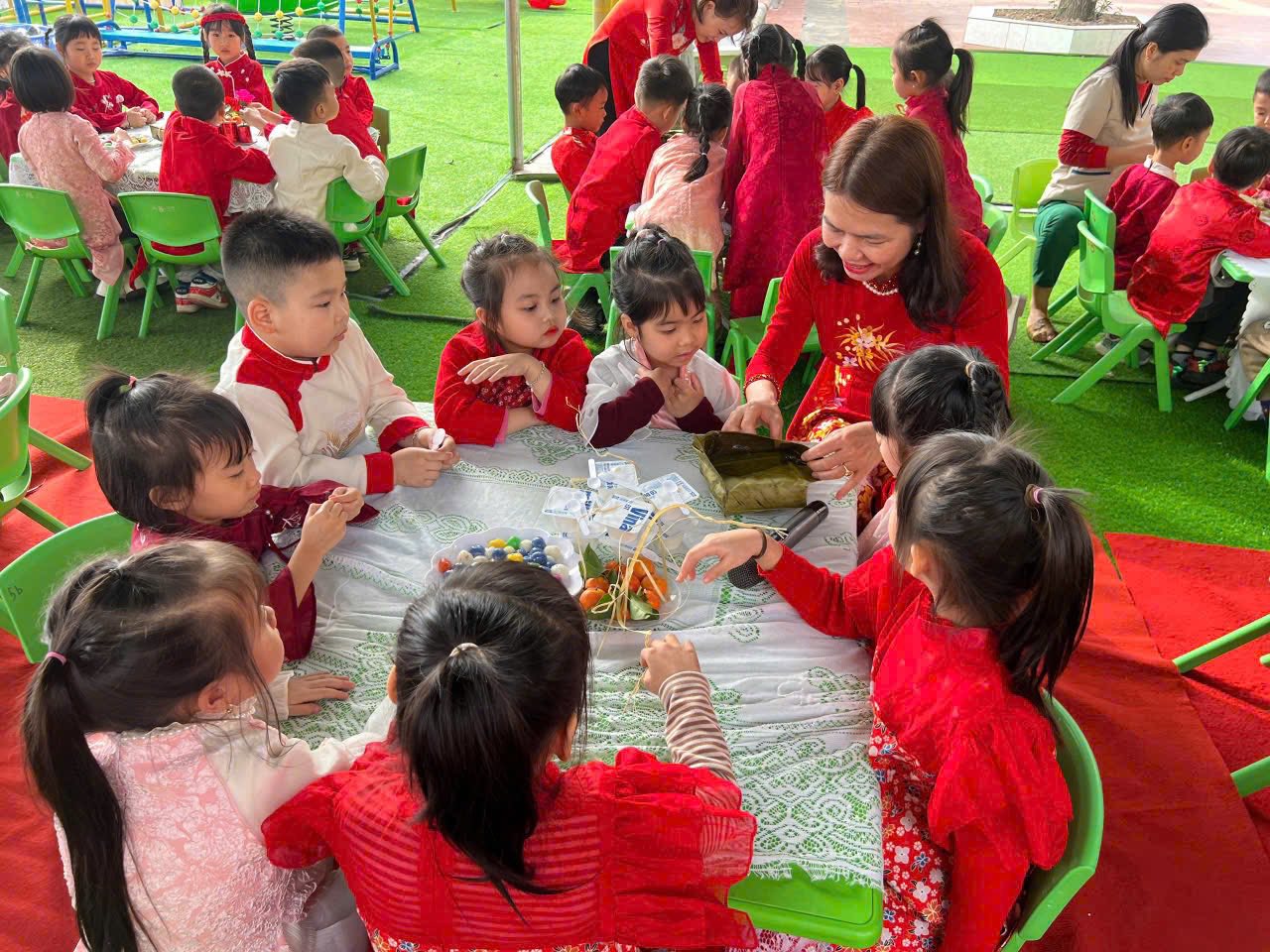 – Gói bánh chưng xanh – Học nét đẹp truyền thống: Từng đôi tay nhỏ xíu nâng niu chiếc lá dong, hạt nếp, giúp các con thêm yêu và hiểu về phong tục ý nghĩa của dân tộc.
